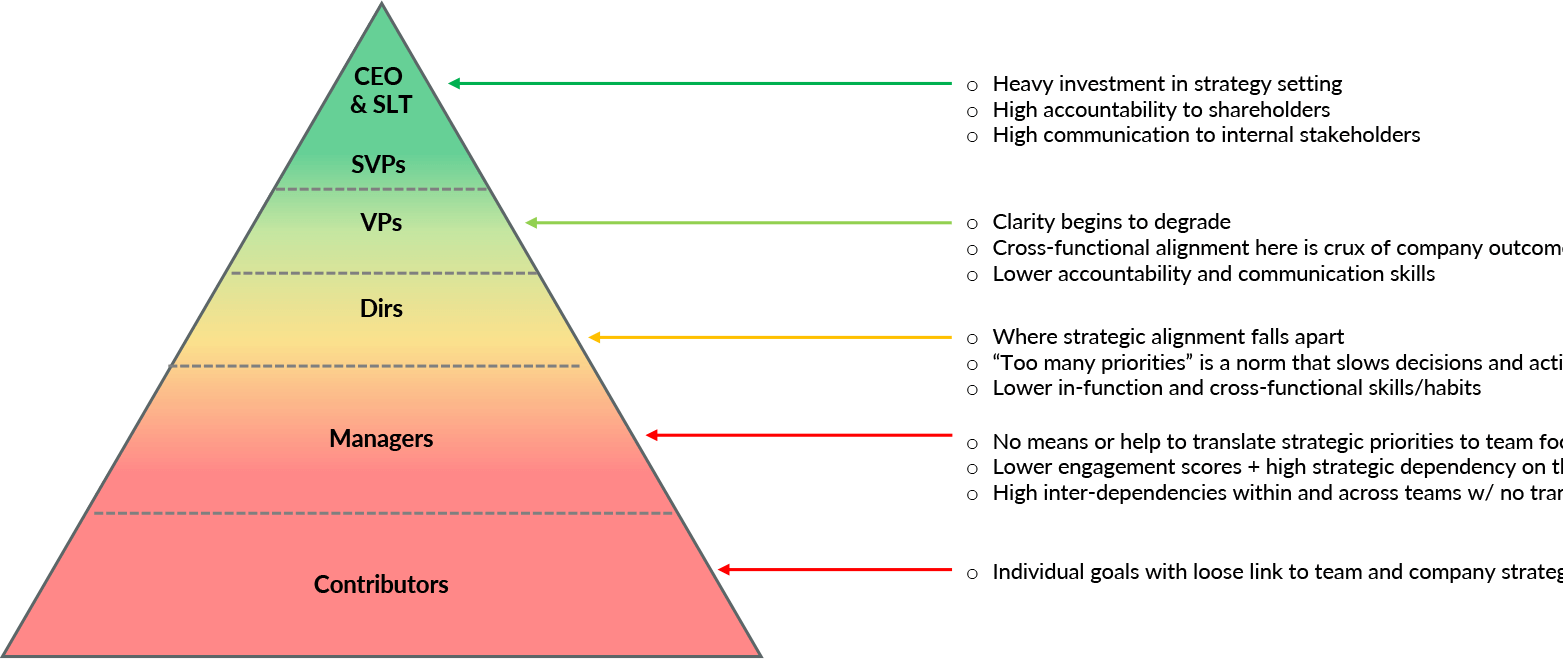 This benefit is lost entirely when companies rotate to “process purity”, moving slowly to perfect the writing of OKRs at each level before they roll out their strategy execution platform as if simply writing strategic priorities drove achievement. These rollouts take over a year, giving companies 5-10% alignment while they have little or no transparency on 90-95% of their organizational capacity to execute.
