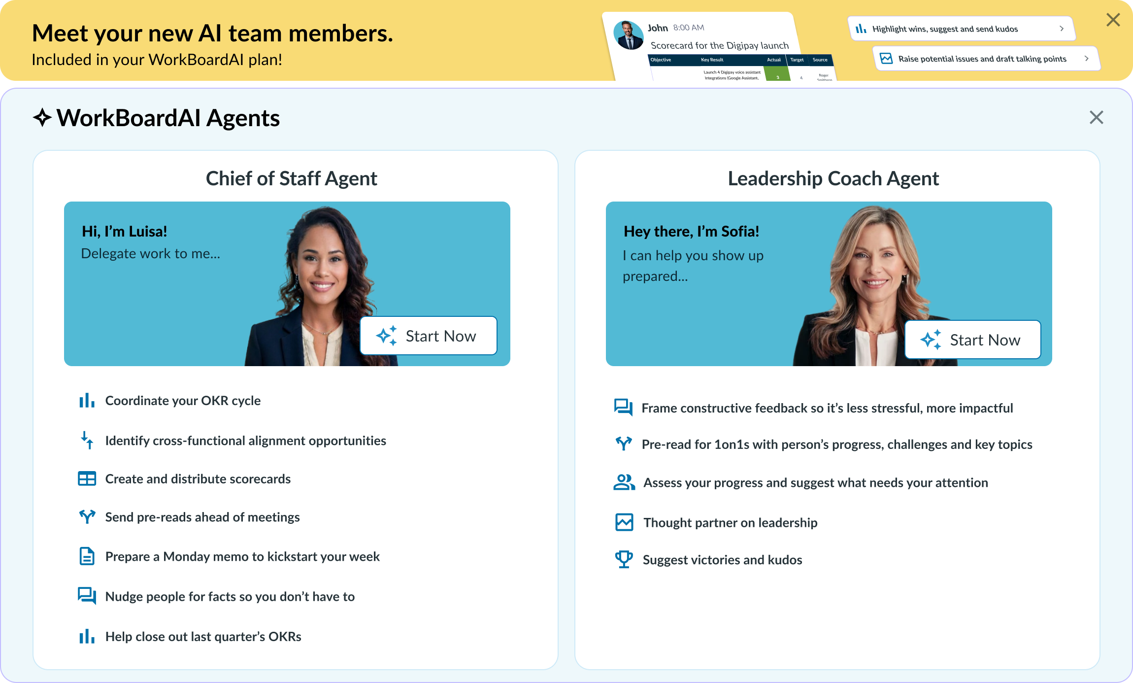 Introducing the digital chief of staff that helps people leaders orchestrate their team operating rhythm and execute at their best. It can coordinate OKRs, create scorecards, send meeting pre-reads, make sure leaders see risks as early as possible, get risky KRs on meeting agendas, and update people on progress.