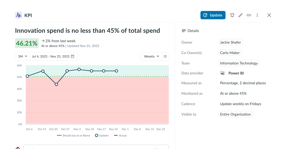 See, set and update OKRs, drive execution with business reviews and scorecards, and get instant visibility into risks with the OKR Heatmap